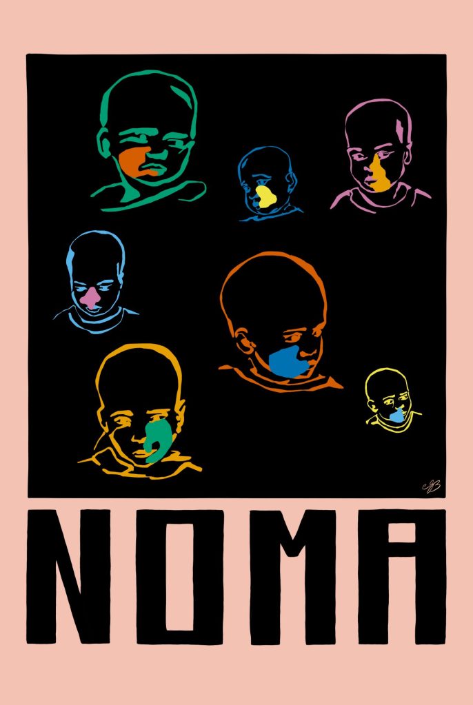 This poster represents vivid images of children who are affected by the disease Noma. Coloured patches identify the dreadful ulcers that Noma inflicts on their flesh.